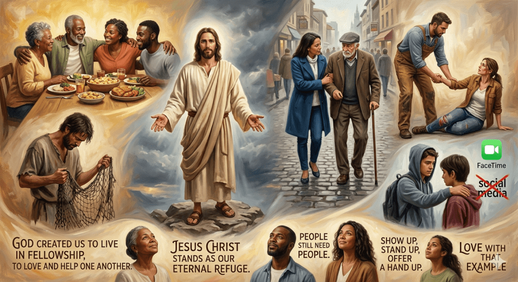 Even so, we are not meant to walk alone. People still need people, for God often shows His love through human hearts and hands, not social media or FaceTime… Show up, stand up, offer a hand up